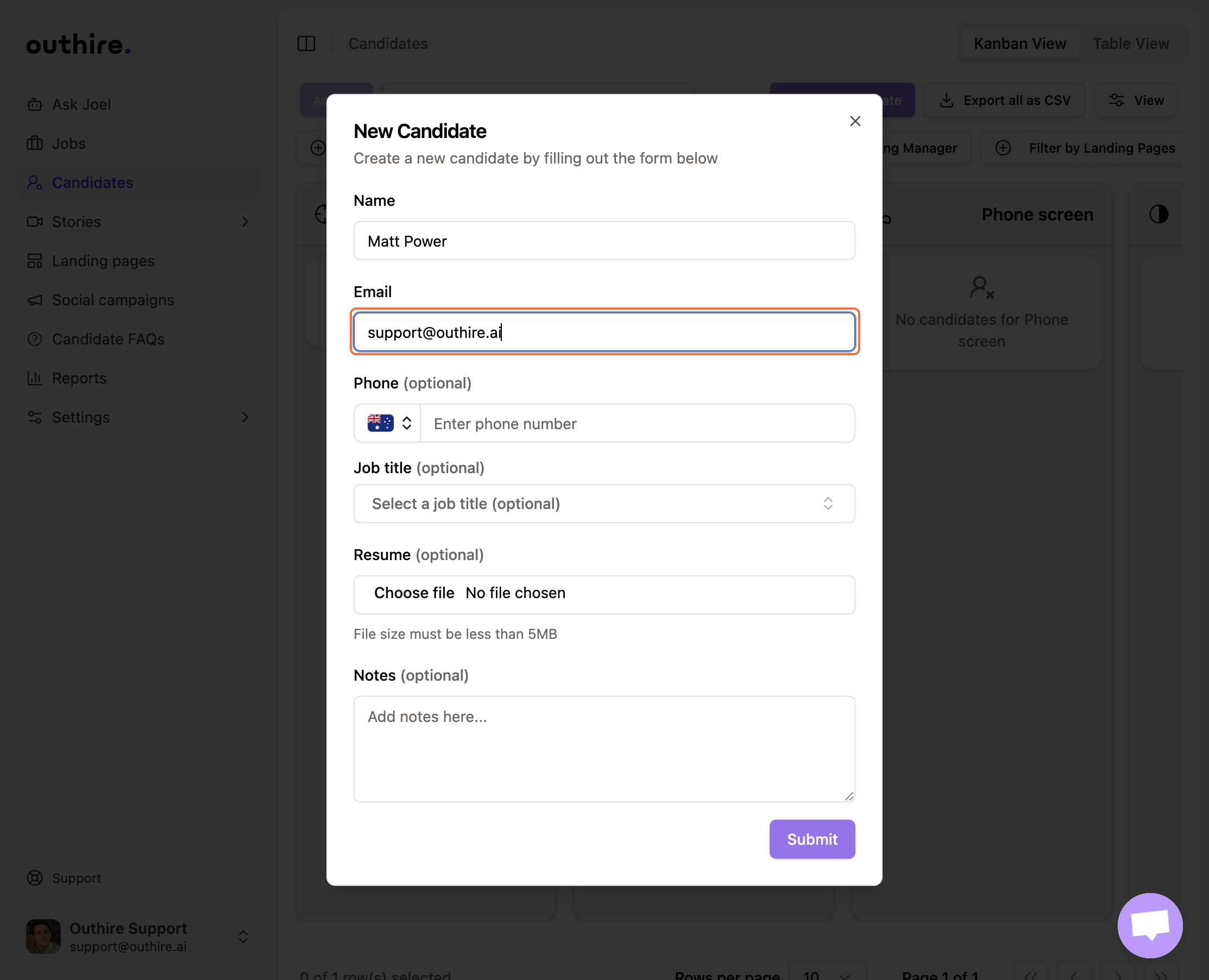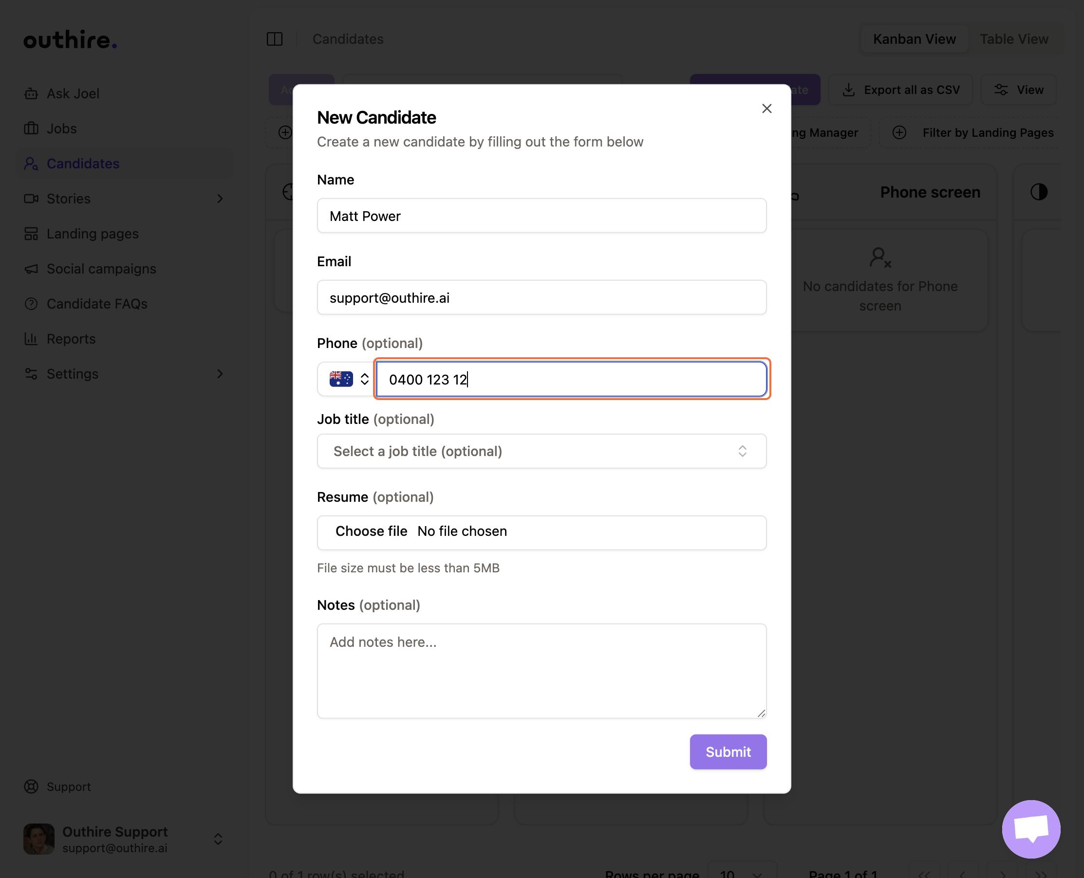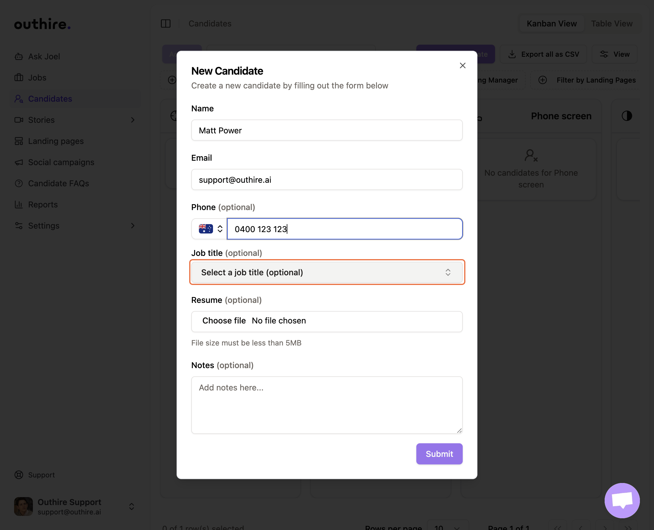 Learn how to manually add a candidate to your Outhire account. This guide walks you through entering candidate details, assigning them to a role, and managing their pipeline stage.