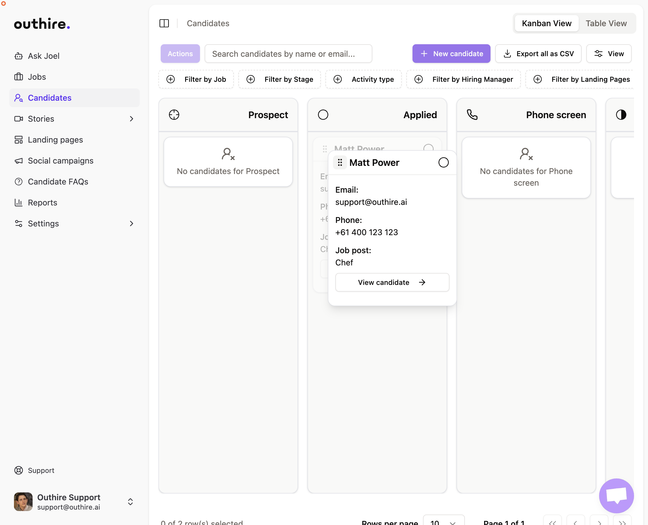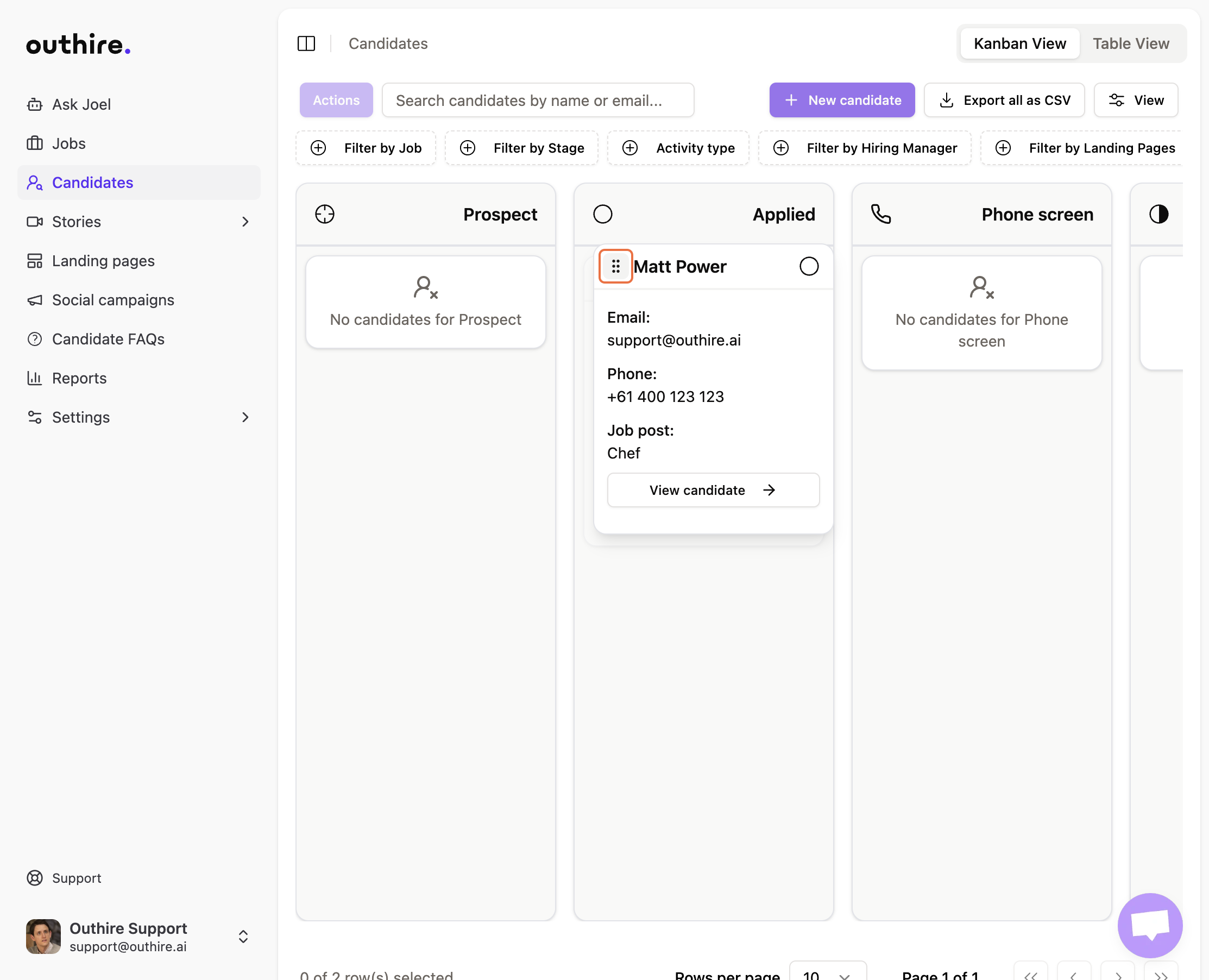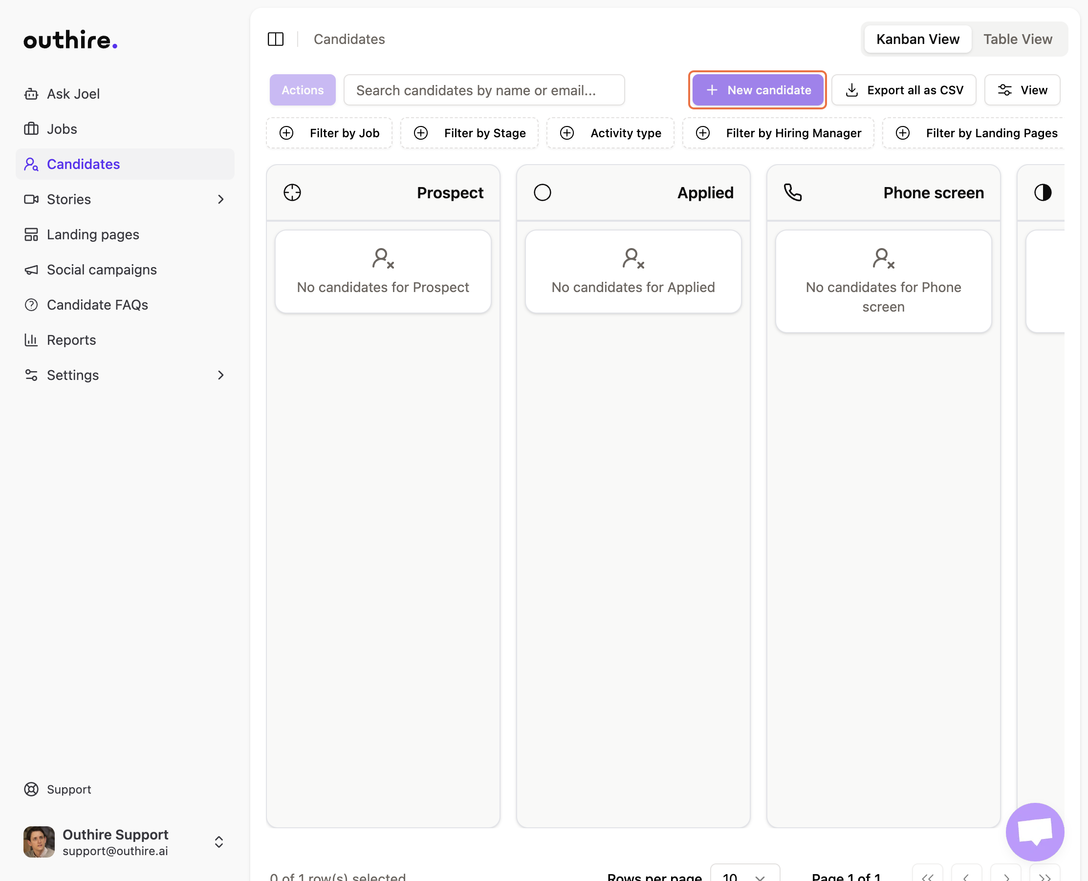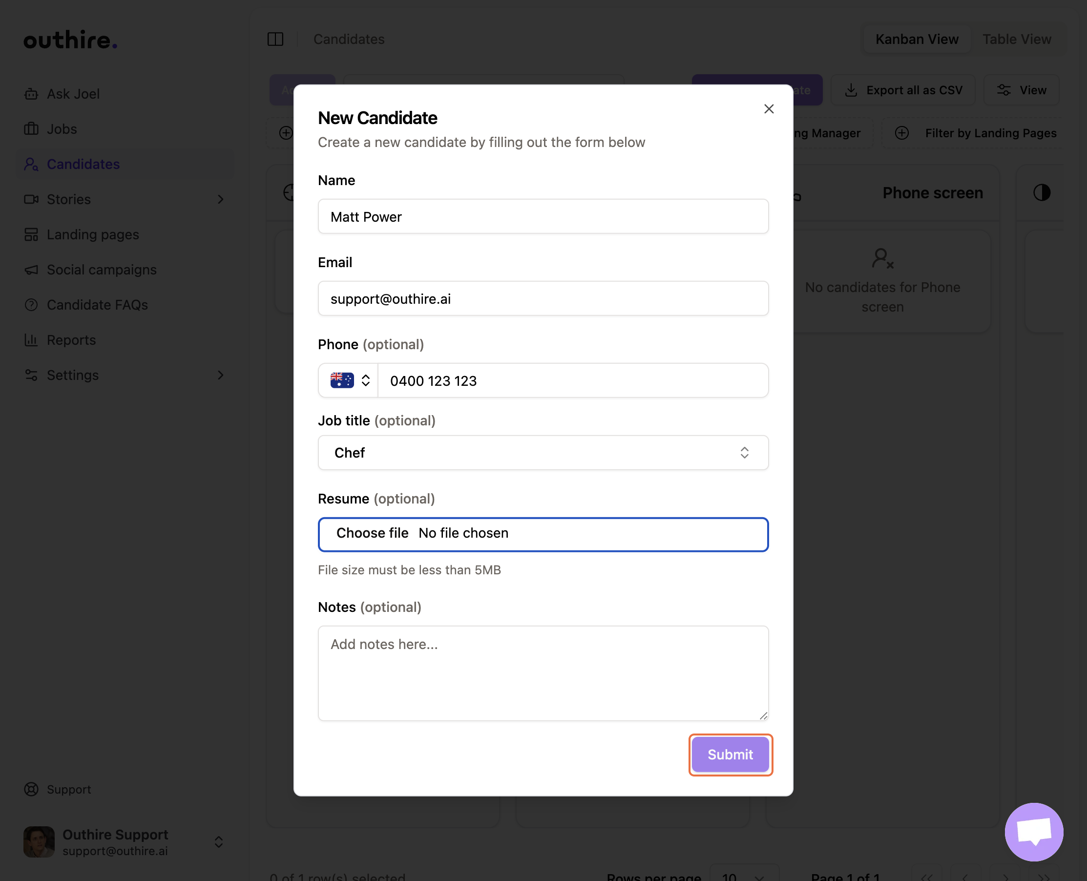 Learn how to manually add a candidate to your Outhire account. This guide walks you through entering candidate details, assigning them to a role, and managing their pipeline stage.